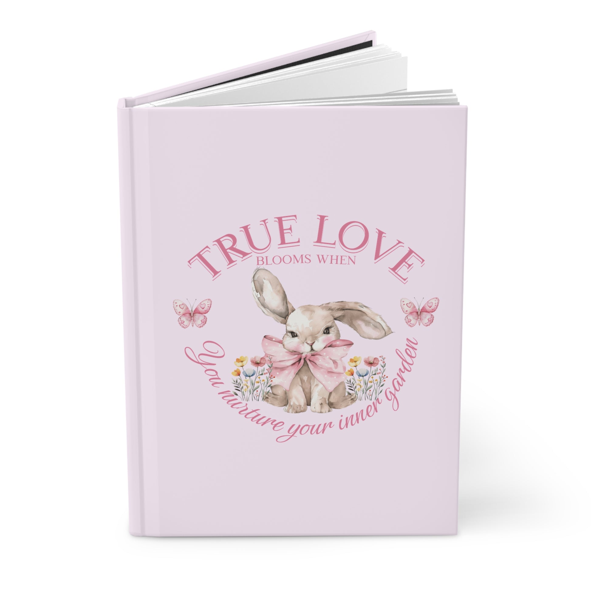 Soft as a secret kept between friends, this matte hardcover journal invites gentle moments of reflection. Pale blush covers cradle a sweet watercolor bunny framed by tiny blossoms and butterflies, with the phrase ‘True Love blooms when you nurture your inner garden’ curving above and below — a quiet reminder to tend to the little things that grow joy. Inside, lined pages sit on a sewn spine that opens flat, making it easy to sketch, plan, or spill memories. The perforated sheets give freedom to share pages or keep them private. Use it for morning notes, gratitude lists, garden plans, or as a pocket of calm on busy days — it blends soft, nostalgic charm with practical, durable construction.